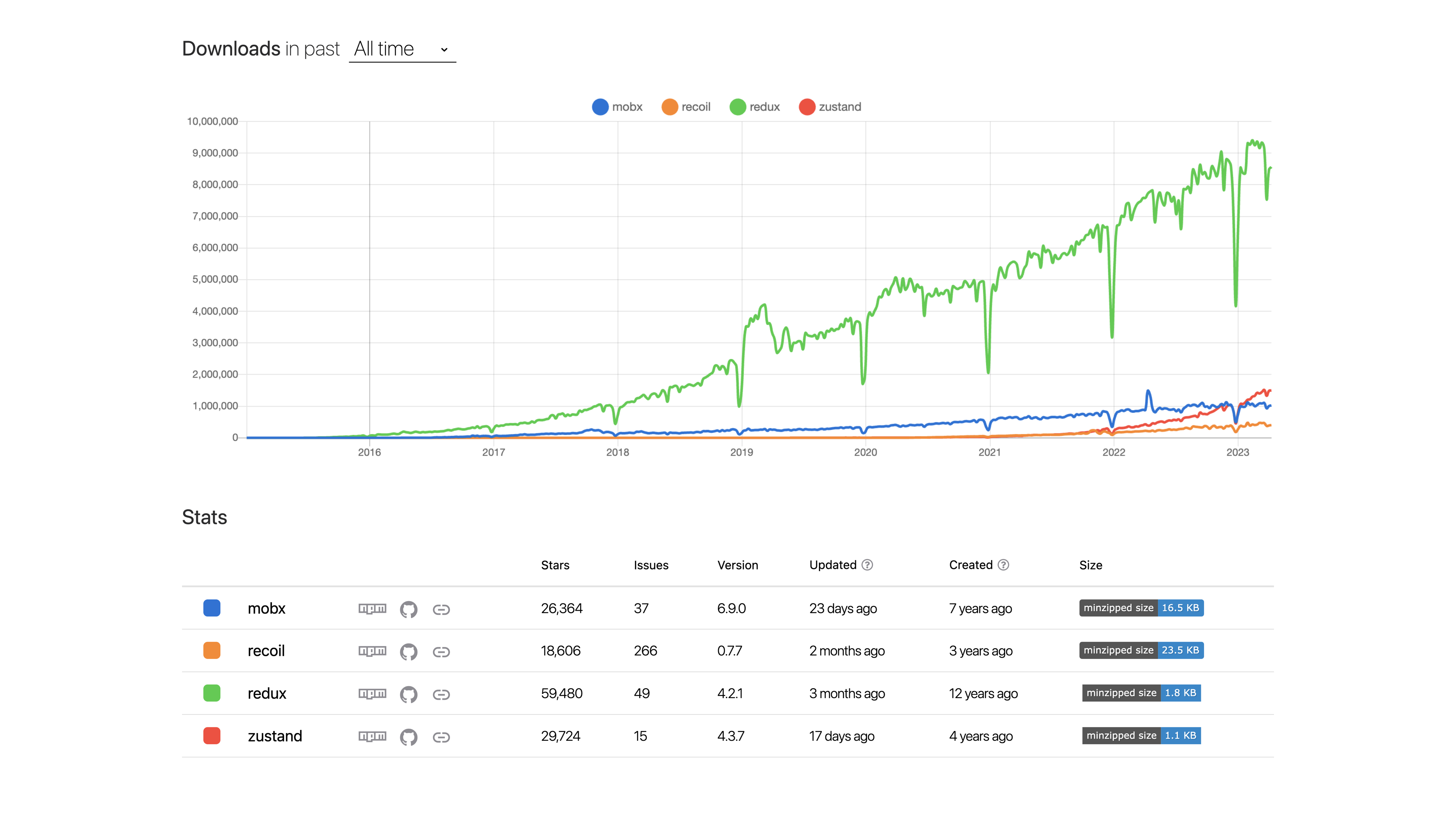 위 차트는 앞에서 소개한 상태 관리 라이브러리들의 npm trend를 나타낸 것입니다.